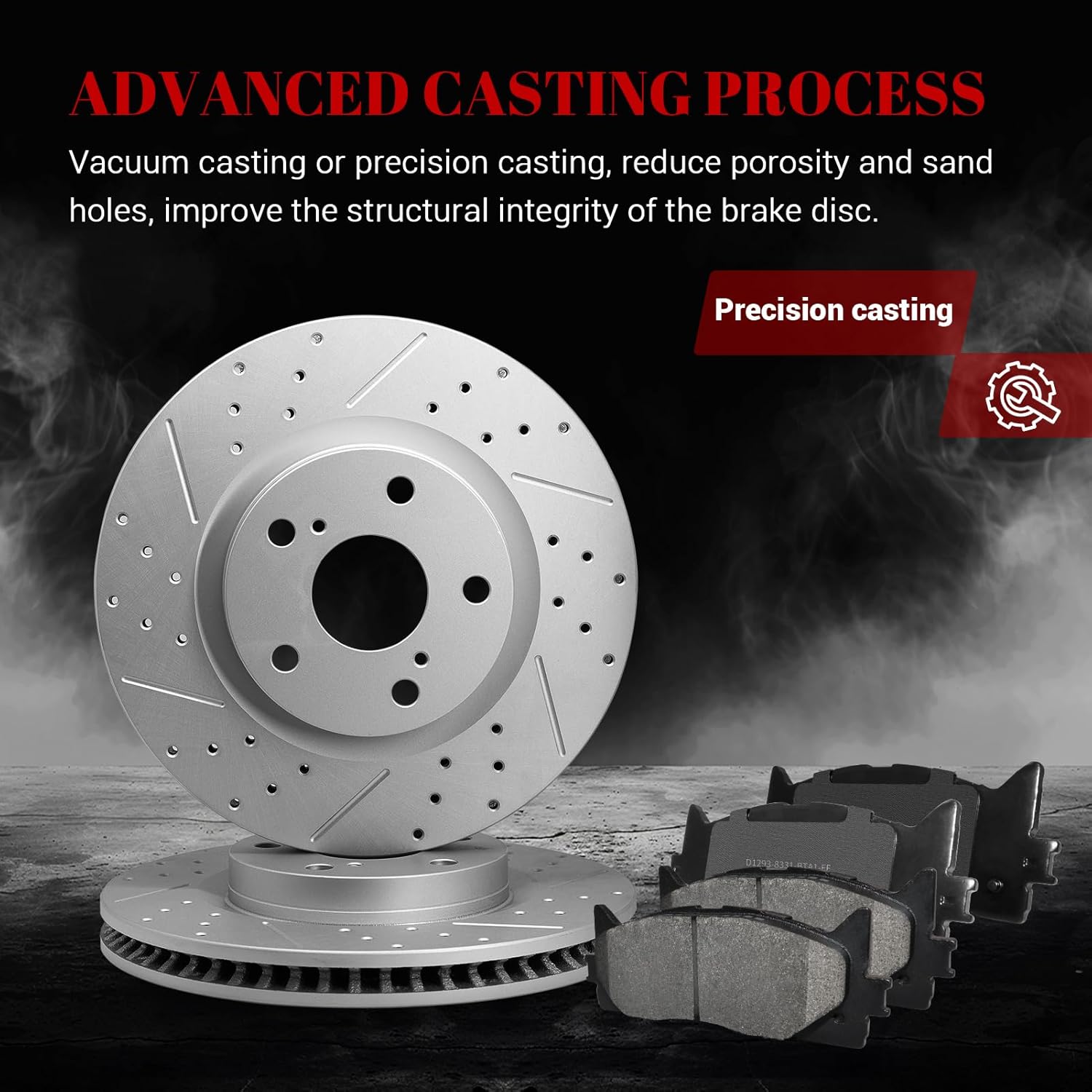 | Included Components | 2 Piece Front Drilled & Slotted Vented Rotors, 2 Piece Rear Drilled & Slotted Solid Rotors, 4 Piece Front Ceramic Brake Pads, 4 Piece Rear Ceramic Brake Pads, Brake Grease |