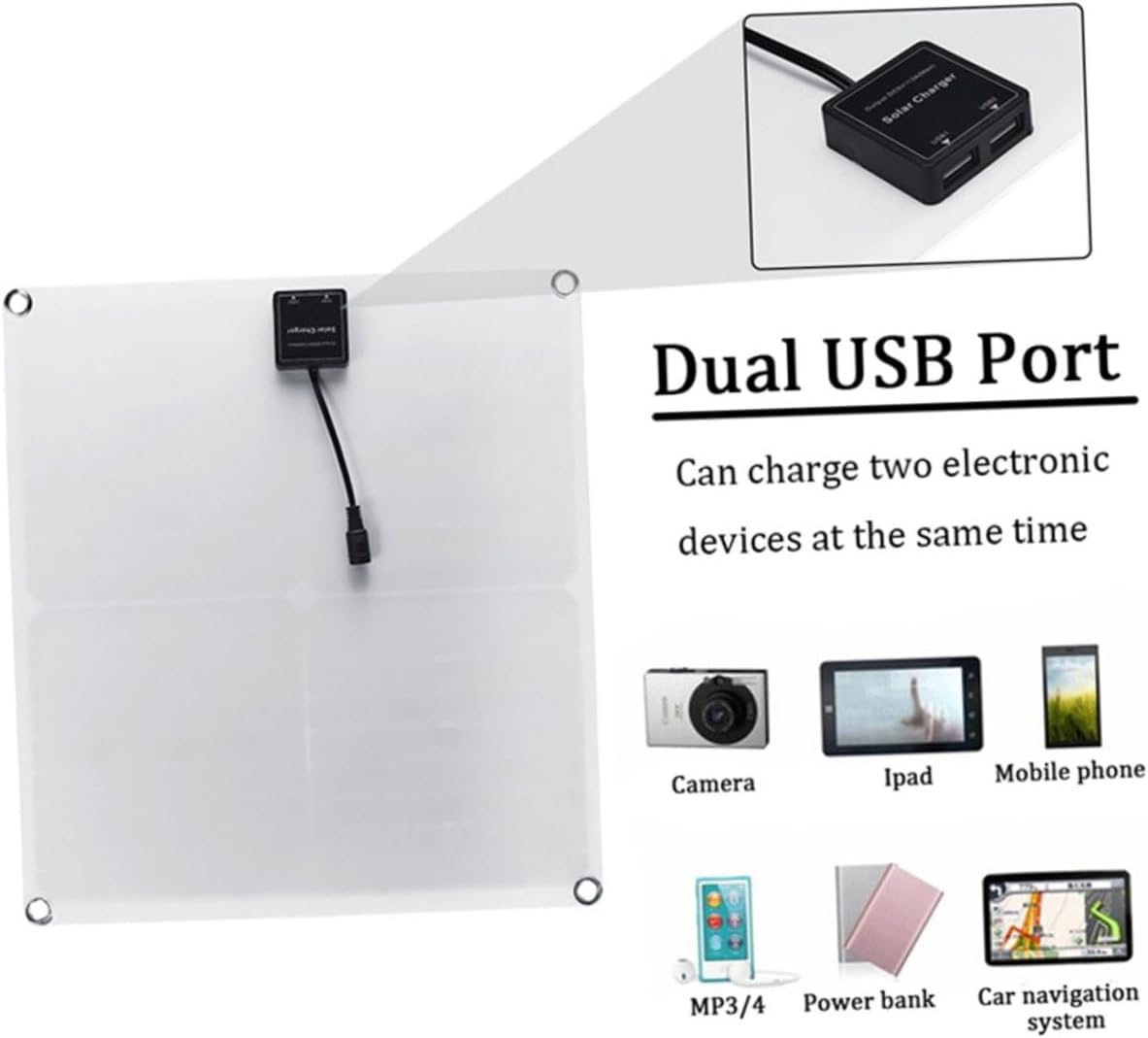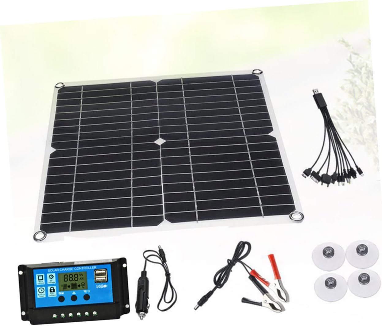 Package List 1 panel 2 x carabiner 4 x suction cups 1 x alligator clip power cord 1 x cigarette lighter cord Features - Work voltage: 18V car battery solar charger - USB output: 5V 2000mA / 1200mA outdoor solar charger - Maximal power: 20W solar charger panel - Efficiency: 21% solar charger - Junction box: 1xDC, 2 - Size: About 36x33x0.25cm/14.17x12.99x0.09inch. -Product Info:Solar panels - Output DC5.5x2.1 output: 12V 1 00 0ma - Material: EVA, PET. - Color: Black. - Specially for charging 12V battery and 5V equipment. Good material for use solar cell panel with controller. - Equipped with 12V and 5V USB output interface. Light weight , easy to carry. - EVA on the front panel is flexible, light but durable. A nice gift for camping lovers. - Mono-crystalline solar cell, the efficiency is as 21%. Essential tool to protect your safety. - With 4 holes and 2 free make it easier to install. IP65 waterproof rating, suitable for outdoor use under light rain.Goods Descriptionsolar cell panel with controller Are you looking for a professional, yet solar panel with controller? Are you in search of a sturdy, trustworthy tool that can do multiple jobs at once? , ! Our professional solar panel with controller must meet you needs.car battery solar charger It is one of the for you